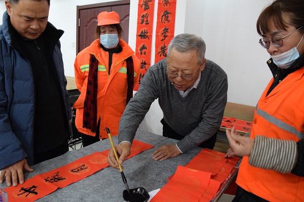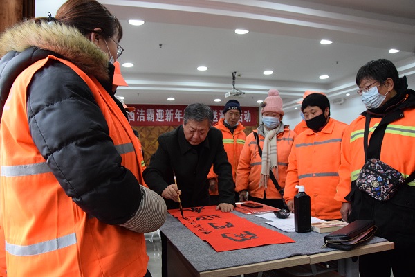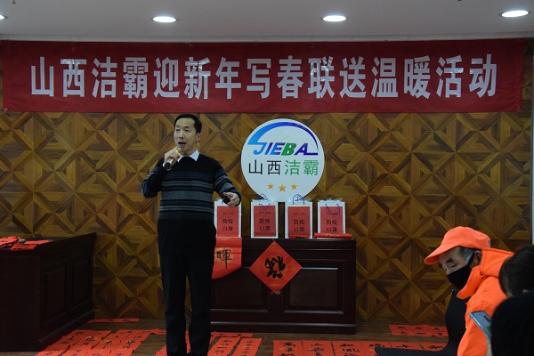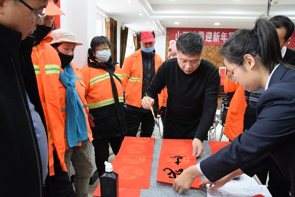現(xiàn)場(chǎng)人頭攢動(dòng),熱鬧非凡,處處洋溢著歡樂喜慶的氣氛。賈大一老師剛執(zhí)墨筆,就吸引了現(xiàn)場(chǎng)數(shù)十名員工駐足觀賞。他的書法如行云流水,一副寓意著對(duì)新年美好祝福的春聯(lián)便一氣呵成。各位老師揮毫潑墨,一幅幅散發(fā)著清新墨香的春聯(lián)展現(xiàn)在大家面前!懊坊í(jiǎng)”獲得者張保平老師現(xiàn)場(chǎng)演唱上黨梆子戲曲名段,字正腔圓,渾厚豪邁,把活動(dòng)推向了高潮。市總工會(huì)副主席韓敦峰為員工分發(fā)了對(duì)聯(lián)和防疫口罩。