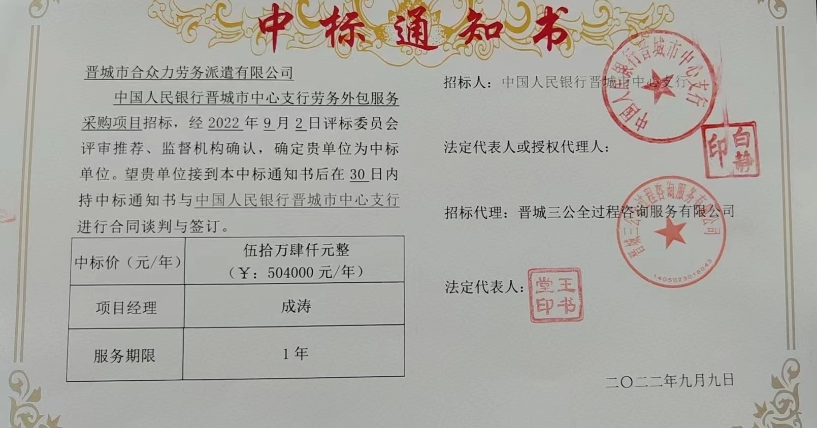 近日,晉城市合眾力勞務(wù)派遣有限公司收到《中標(biāo)通知書》,確定公司為中國(guó)人民銀行晉城市中心支行勞務(wù)外包服務(wù)采購(gòu)項(xiàng)目的中標(biāo)人,中標(biāo)金額504000元。
