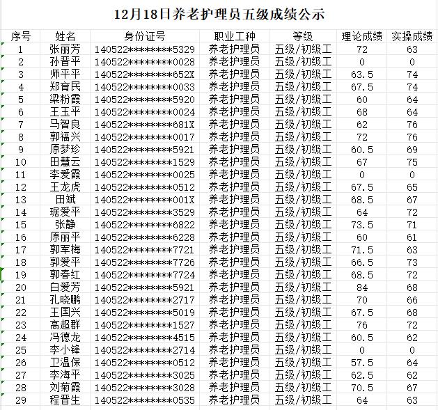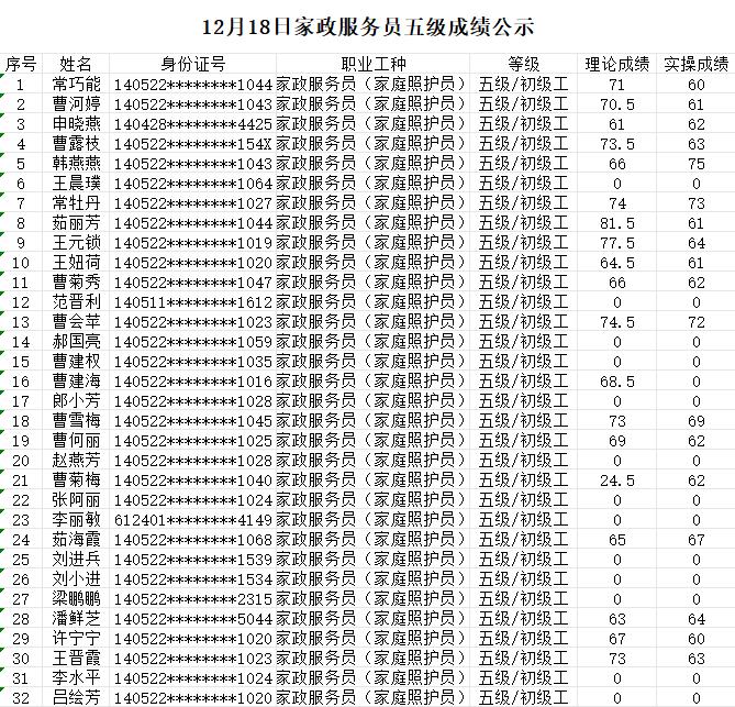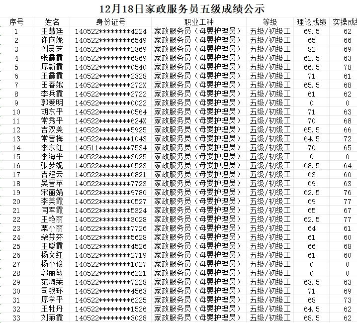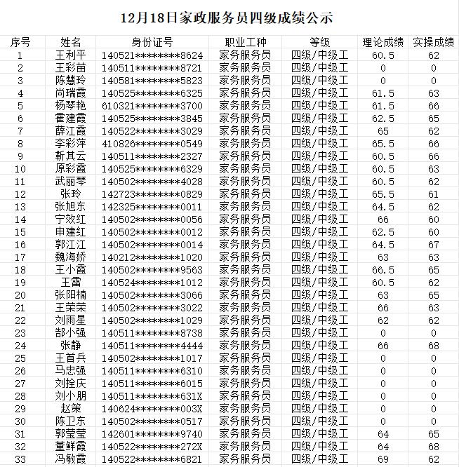 晉城市潔霸清潔服務股份有限公司職業(yè)技能等級認定中心現(xiàn)將2023年12月18日認定人員成績公示如下: