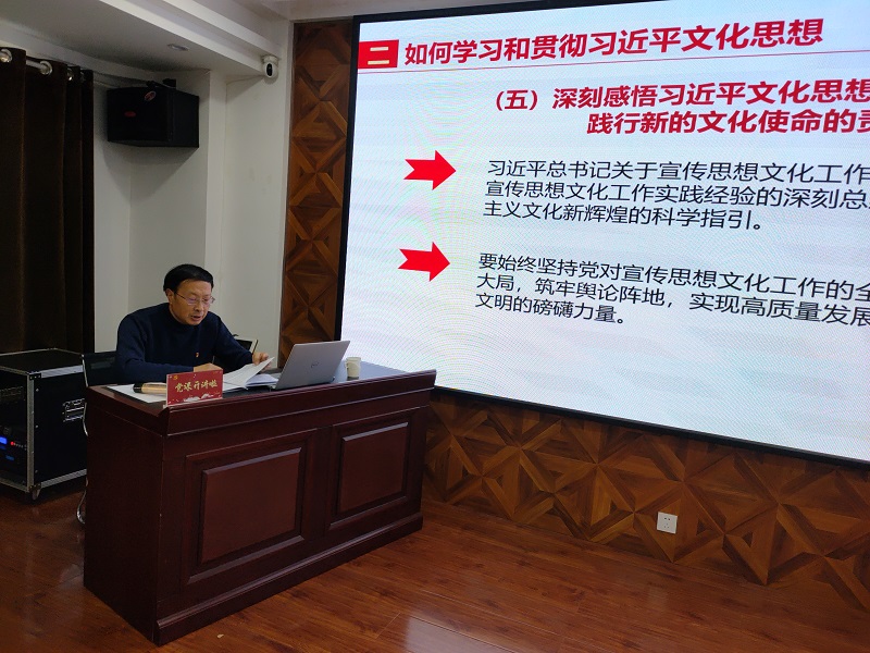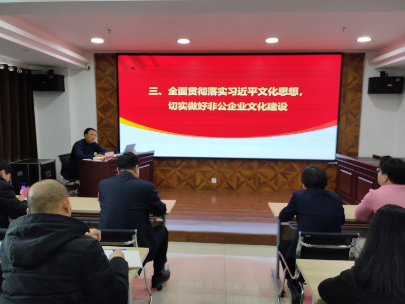 郝天順從習(xí)近平總書(shū)記對(duì)宣傳思想文化工作作出的重要指示談起,從“如何認(rèn)識(shí)和理解習(xí)近平文化思想 ”“如何學(xué)習(xí)和貫徹習(xí)近平文化思想”“全面貫徹落實(shí)習(xí)近平文化思想,切實(shí)做好非公企業(yè)文化建設(shè)”三個(gè)方面進(jìn)行了深刻闡述,指出習(xí)近平文化思想既有文化理論觀點(diǎn)上的創(chuàng)新和突破,又有文化工作布局上的部署要求,明體達(dá)用、體用貫通,明確了新時(shí)代文化建設(shè)的路線圖和任務(wù)書(shū),在我國(guó)社會(huì)主義文化建設(shè)中展現(xiàn)出了強(qiáng)大偉力,為做好新時(shí)代新征程宣傳思想文化工作、擔(dān)負(fù)起新的文化使命提供了強(qiáng)大思想武器和科學(xué)行動(dòng)指南,并結(jié)合非公企業(yè)實(shí)際,要求要緊緊圍繞學(xué)習(xí)貫徹習(xí)近平文化思想,圍繞貫徹黨的二十大關(guān)于文化建設(shè)的戰(zhàn)略部署,強(qiáng)化黨建引領(lǐng)作用,帶動(dòng)企業(yè)文化發(fā)展,將文化建設(shè)作為企業(yè)戰(zhàn)略,不斷創(chuàng)新文化理念,將企業(yè)文化實(shí)體化、制度化,促進(jìn)企業(yè)文化升華,推動(dòng)各項(xiàng)工作落地見(jiàn)效。