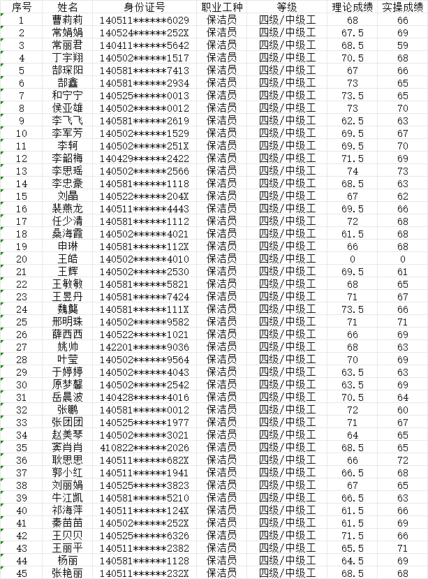 晉城市潔霸清潔服務股份有限公司職業(yè)技能等級認定中心現將2024年1月27日下午認定人員成績公示如下: