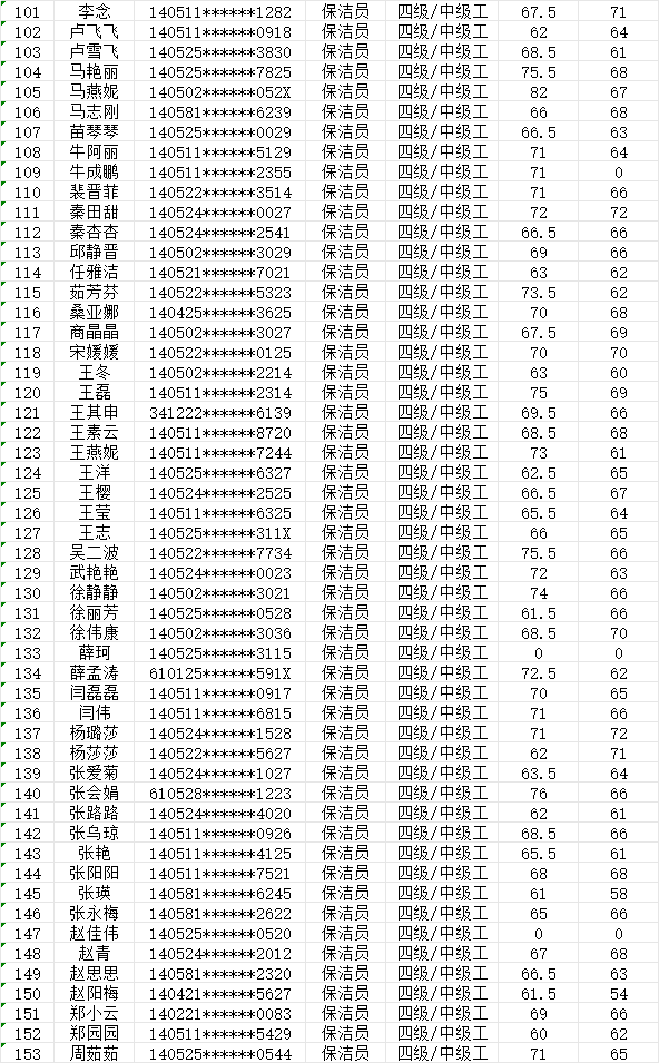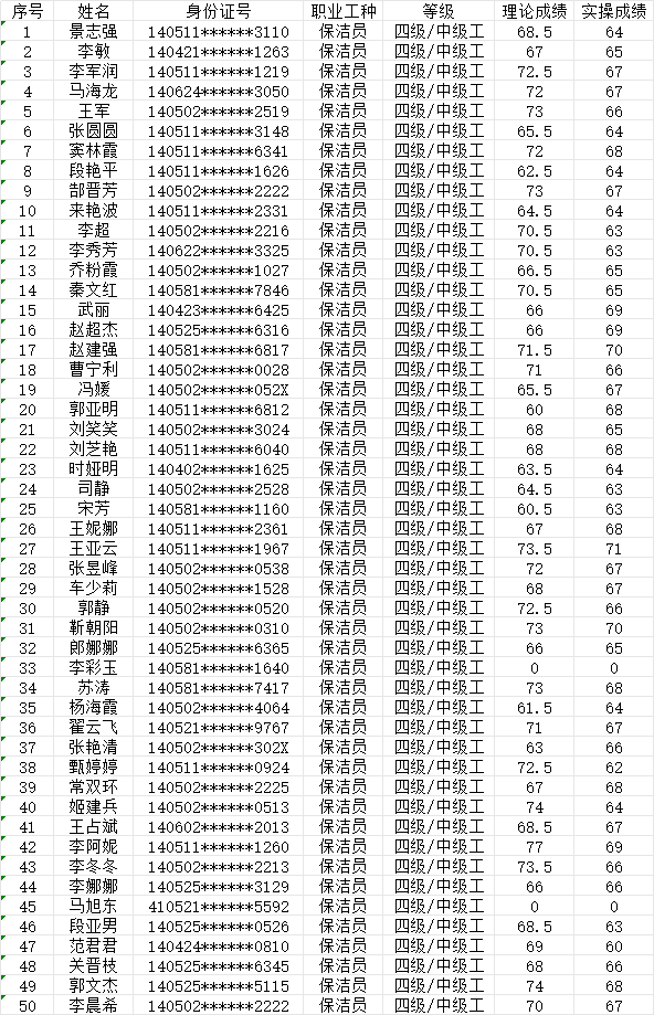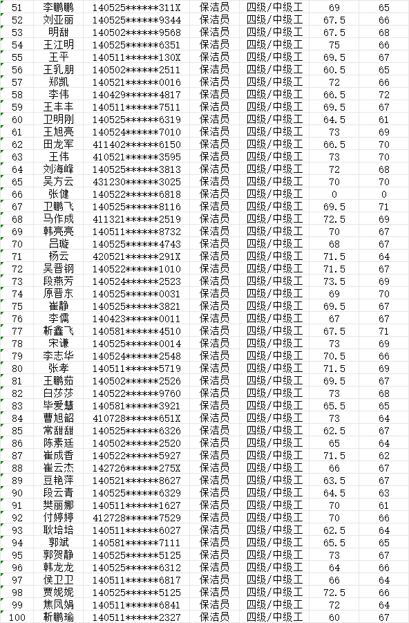 晉城市潔霸清潔服務股份有限公司職業(yè)技能等級認定中心現(xiàn)將2024年1月28日認定人員成績公示如下: