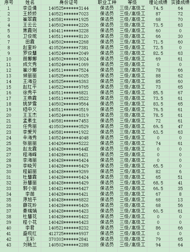 晉城市潔霸清潔服務(wù)股份有限公司職業(yè)技能等級(jí)認(rèn)定中心現(xiàn)將2024年5月12日認(rèn)定人員成績公示如下: