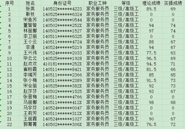 2024年4月28日第1批家政服務(wù)員高級(jí)認(rèn)定人員成績(jī)公示