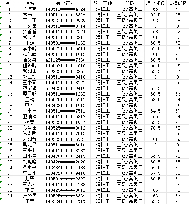 晉城市潔霸清潔服務(wù)股份有限公司職業(yè)技能等級(jí)認(rèn)定中心現(xiàn)將2024714日認(rèn)定人員成績公示如下: