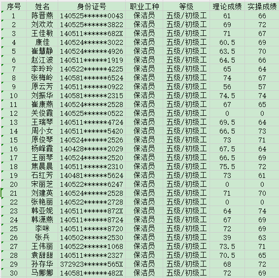 晉城市潔霸清潔服務(wù)股份有限公司職業(yè)技能等級(jí)認(rèn)定中心2024年8月18日第30批保潔員初級(jí)認(rèn)定人員成績(jī)公示