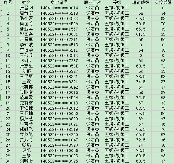 晉城市潔霸清潔服務(wù)股份有限公司職業(yè)技能等級認定中心2024年8月31日第34批保潔員初級認定人員成績公示